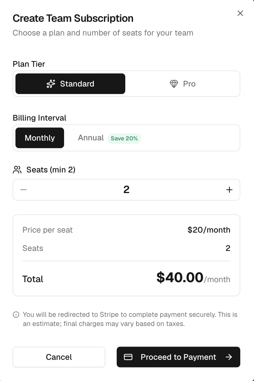 To purchase a subscription, go to the Billing tab and select a plan tier and billing interval (monthly or annual). A minimum of 2 seats is required. Once purchased, seats are immediately available to allocate to members.