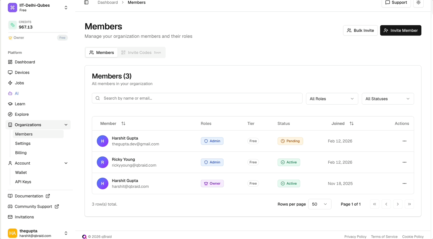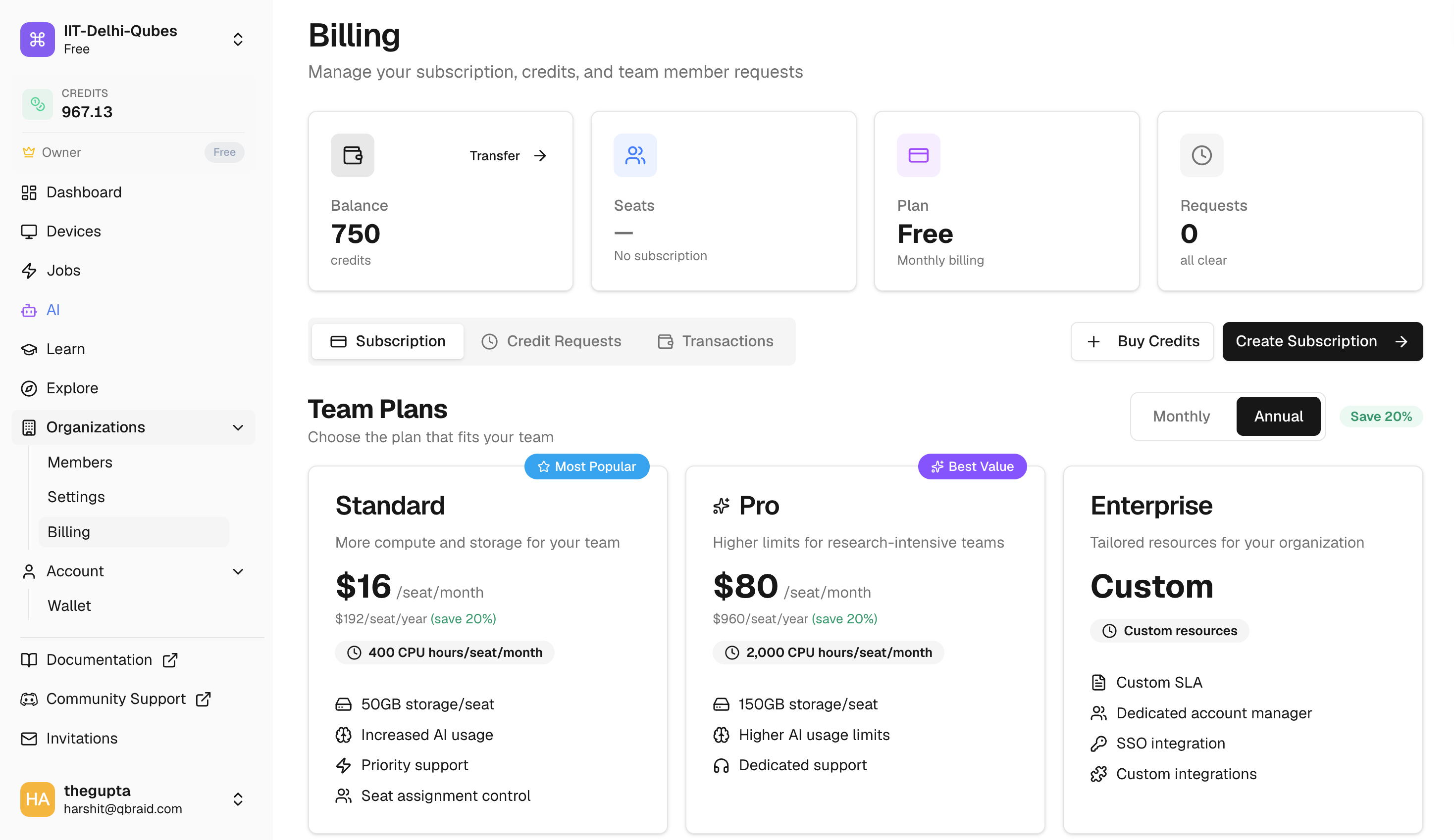 qBraid Organizations support centralized billing, allowing an organization to purchase subscriptions and qBraid credits at the org level and distribute them to individual members.
