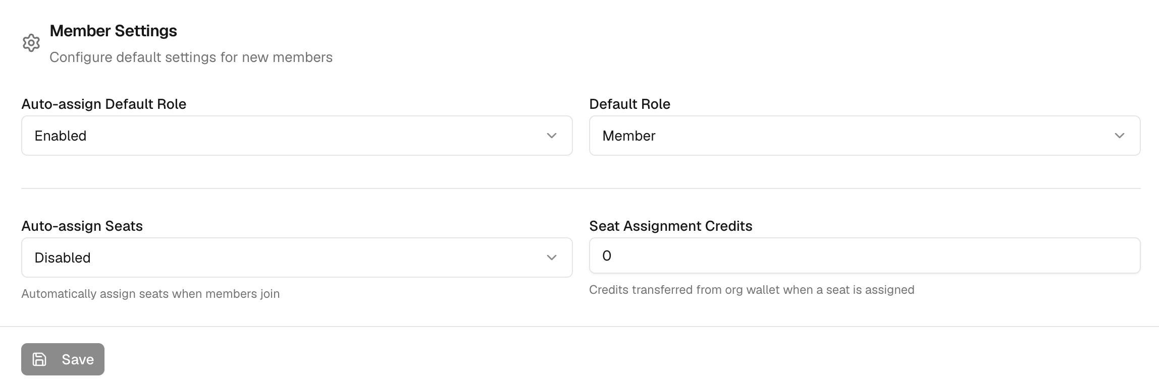 Admins can configure a default credit allocation applied automatically to new members. If a member’s balance reaches zero, their access to paid resources is paused until more credits are allocated.
