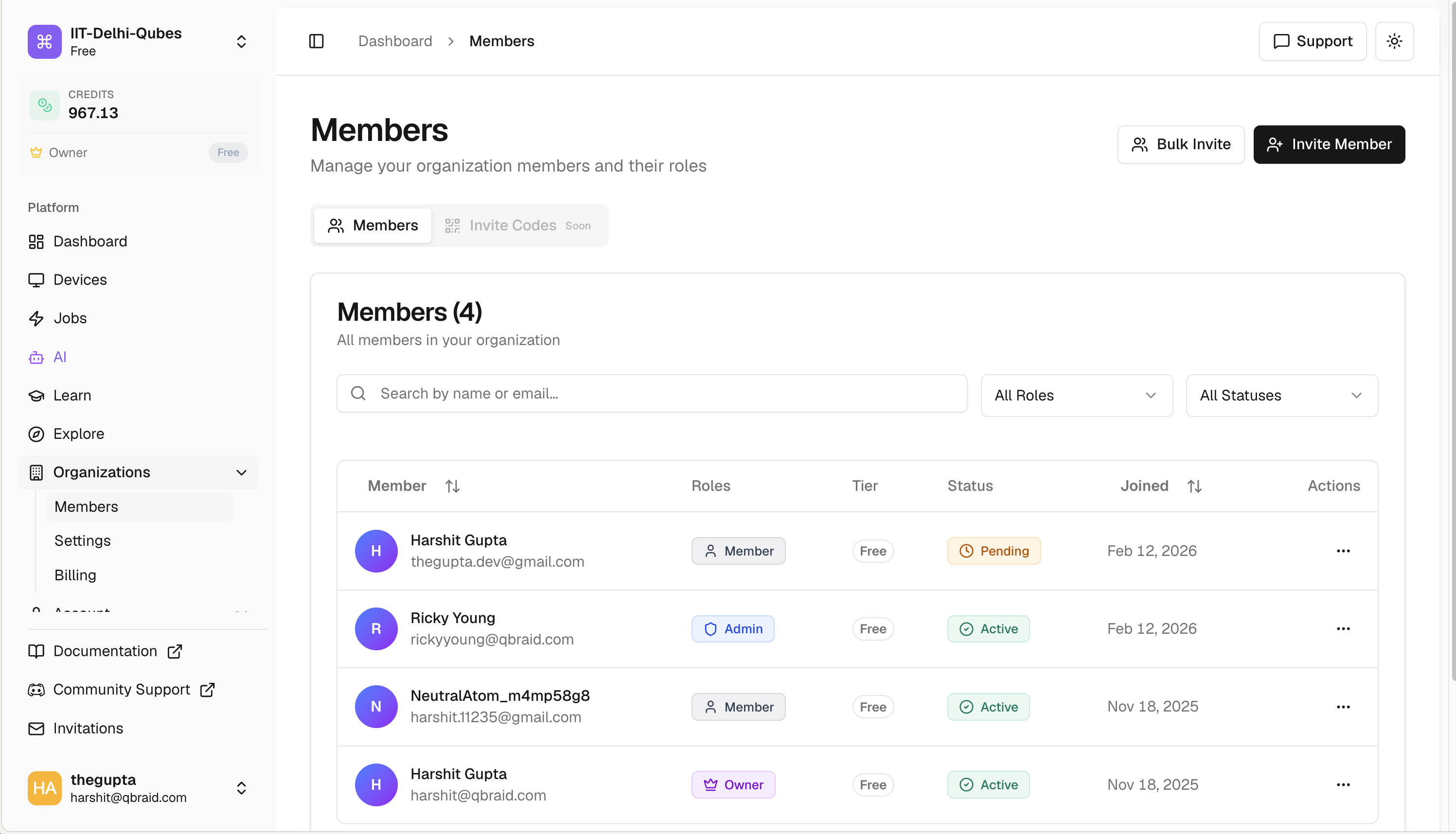 qBraid Organizations provides a centralized way for teams and institutions to manage users, compute resources, and access controls across the qBraid platform. Whether you’re running a research group, teaching a course, or managing an enterprise quantum computing program, Organizations gives administrators the tools to streamline onboarding, enforce policies, and track usage across members.