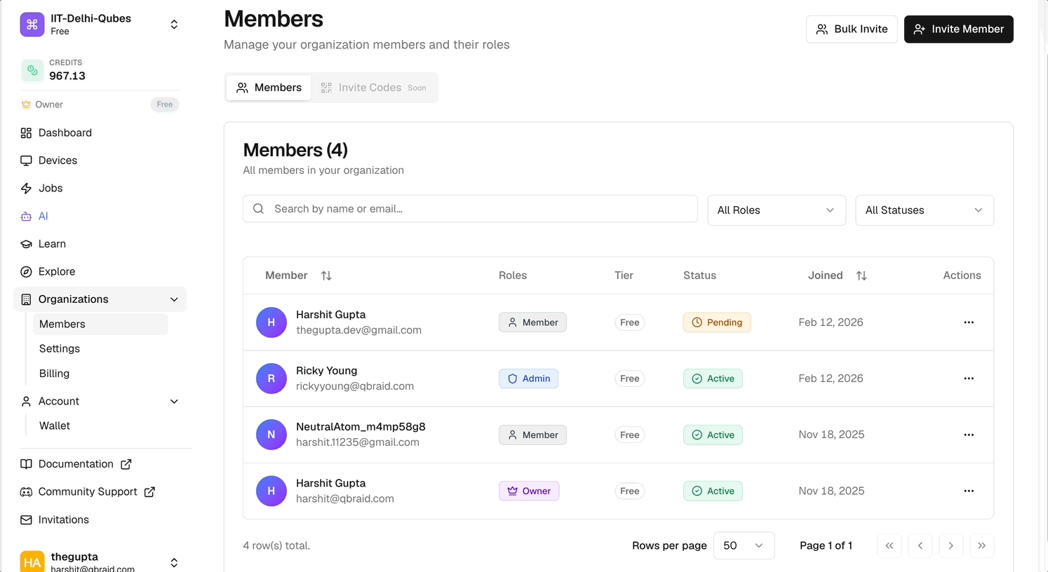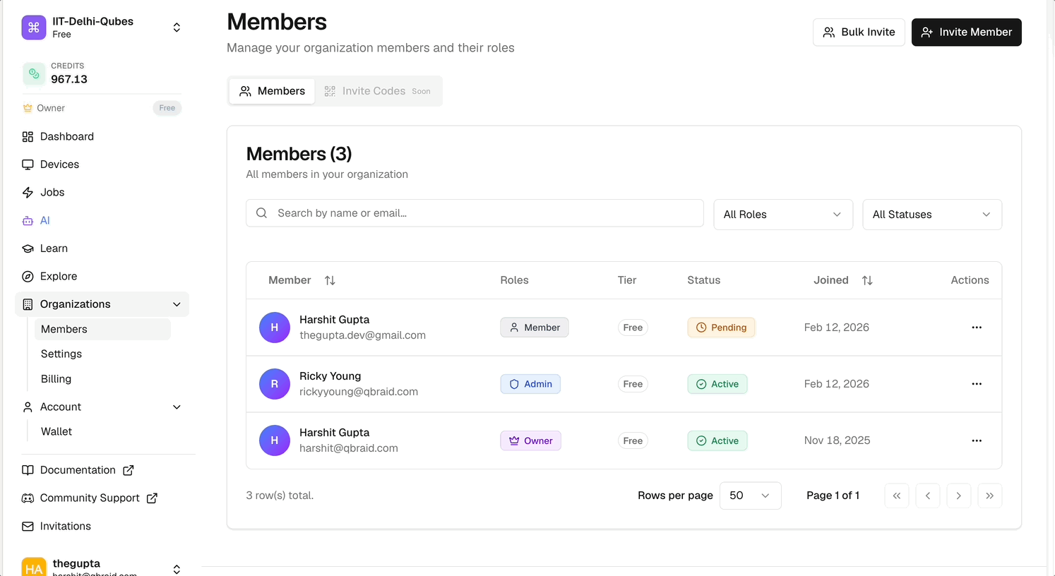 To invite a member, enter their email address and select a role before sending the invite. The user will receive an email with a link to accept and join the organization. If they don’t yet have a qBraid account, they’ll be prompted to create one first.