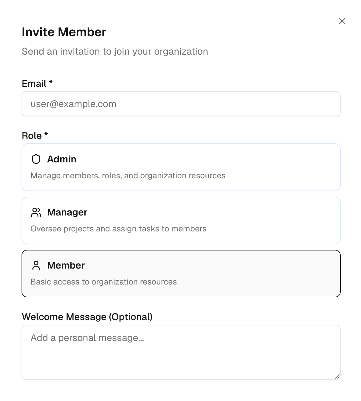 | Member | Standard access to organization resources. Cannot manage settings, resources, or other users. |