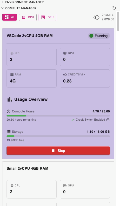 As part of the Environment Manager is the Compute Manager extension, which allows you to connect to and manage remote qBraid Lab compute resources, including CPUs and NVIDIA GPUs.