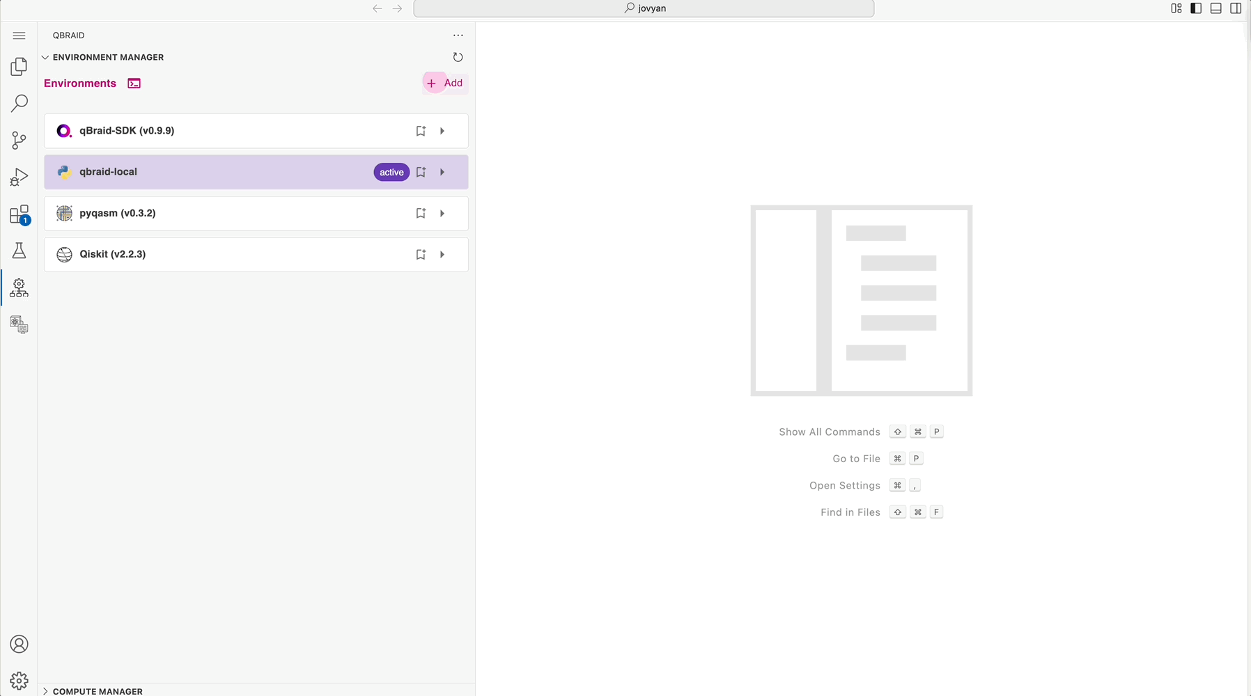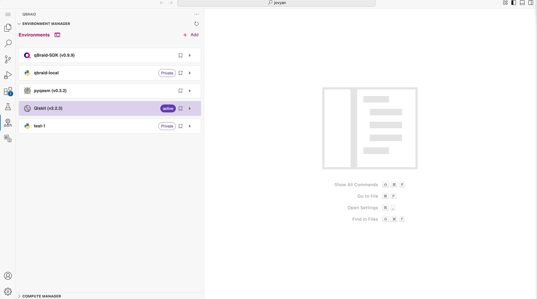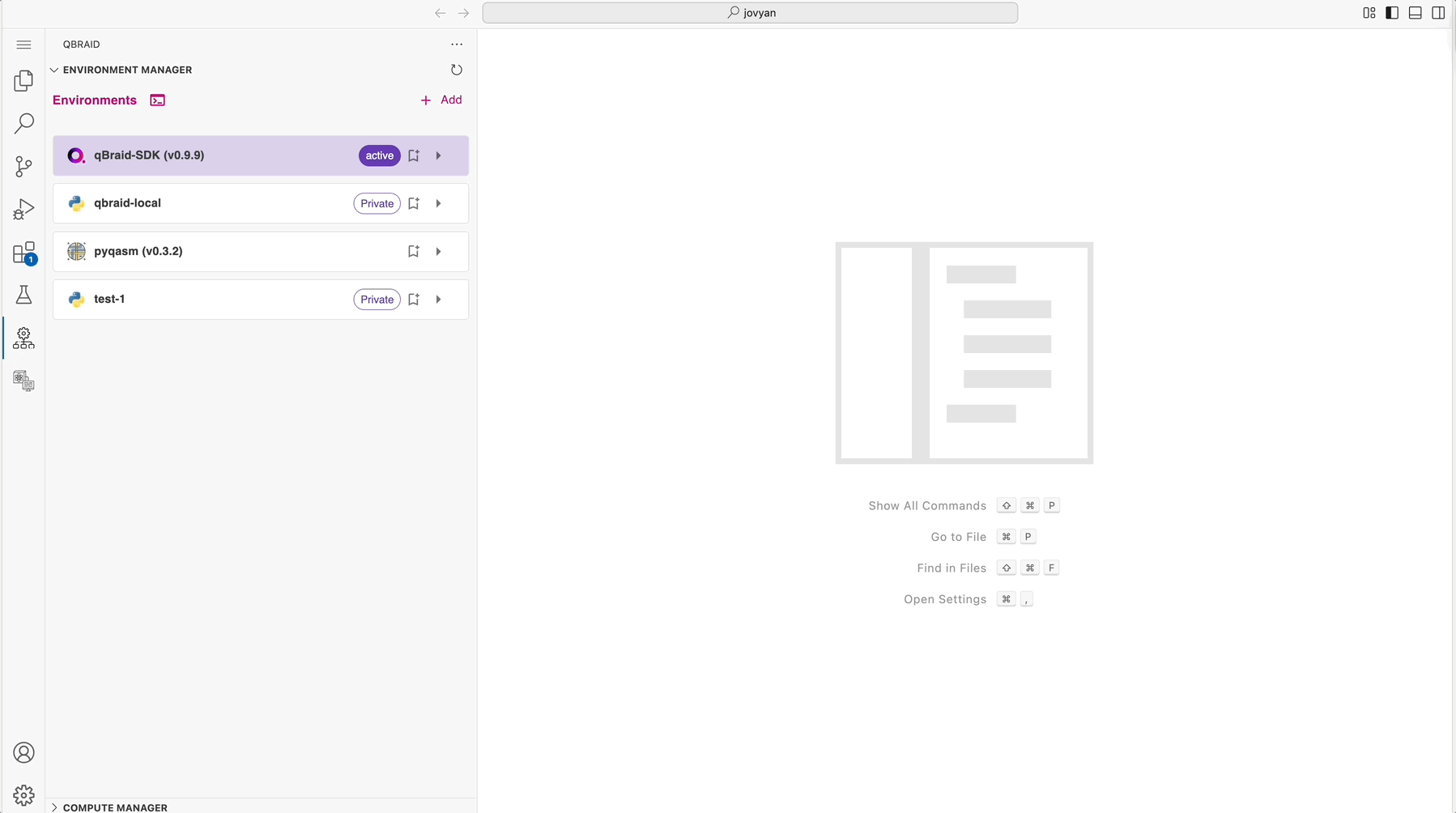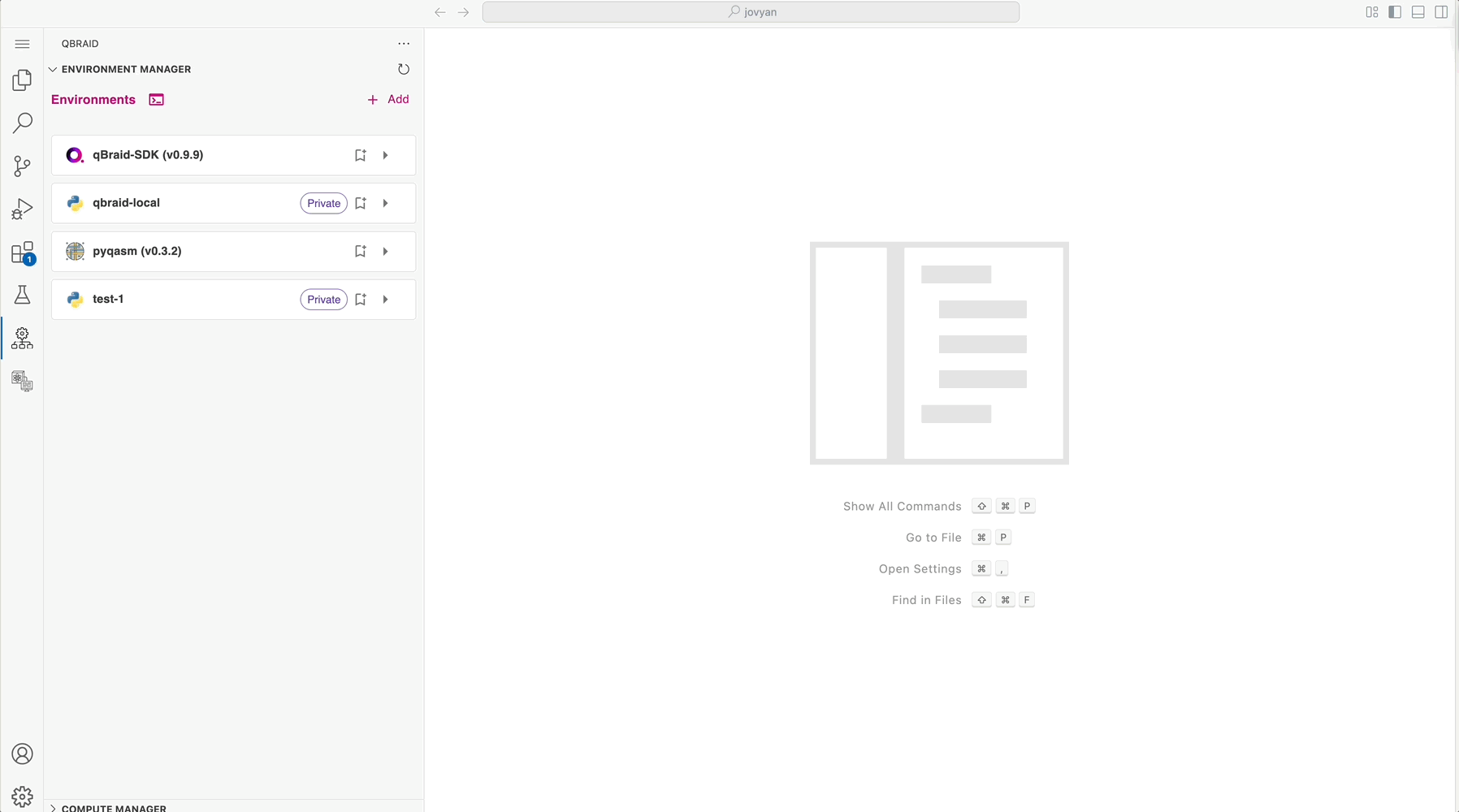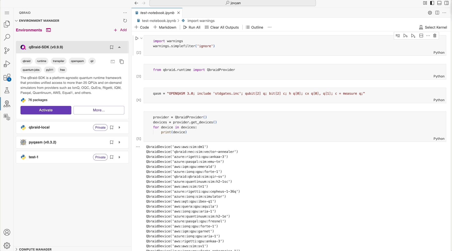 Skip to main contentThe qBraid Environment Manager extension allows you to manage your Python quantum environments directly within Visual Studio Code. This includes creating, viewing, using, removing, editing, and sharing environments both locally and in the cloud.