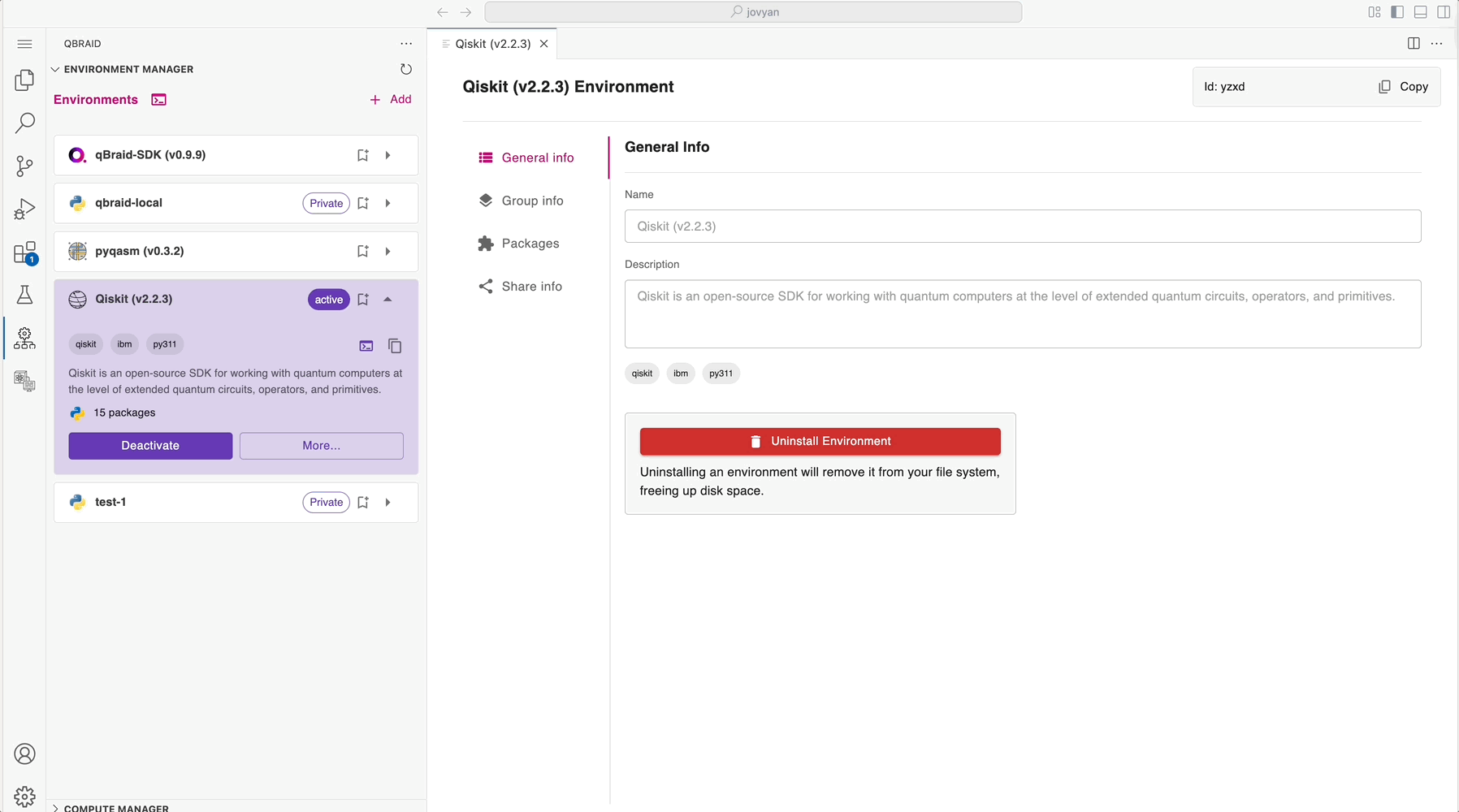 You can also choose to install an environment from the pre-configured groups such as Qiskit, qBraid, etc. -
